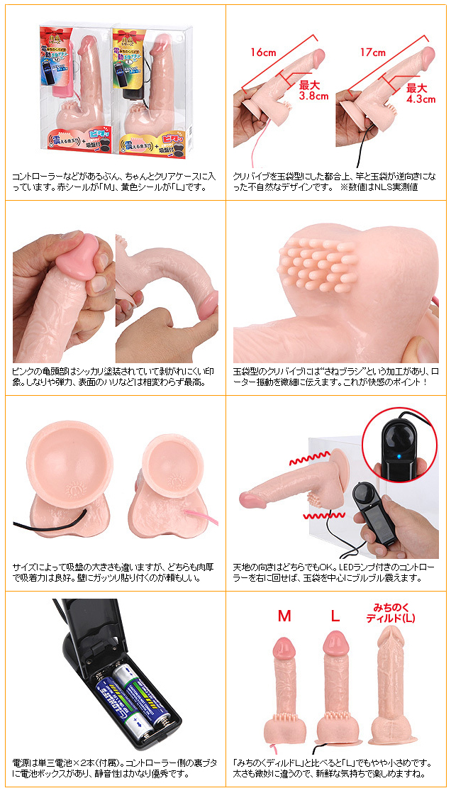 リアルな造形で人気のティルド「みちのく」シリーズのタマタマ部分に細かい「さねブラシ」が付いた!!さらにタマタマ内にはローターを内蔵して強力にクリやアナルを責める!!便利な吸盤付き!!
